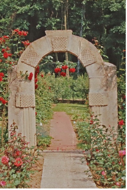 La porte des Lépreux dans ses deux dernières mises en scène : dans le jardin de la famille Hoffmann jusqu’en 2012, puis au rond-point de la rue des Roses (photos coll. CMHL et fln 2022).